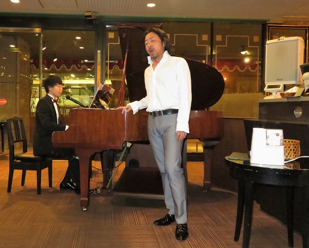 オペラのアリアと映画音楽など3曲を熱唱しました。曲間のトークでは歌声とのギャップで客席から